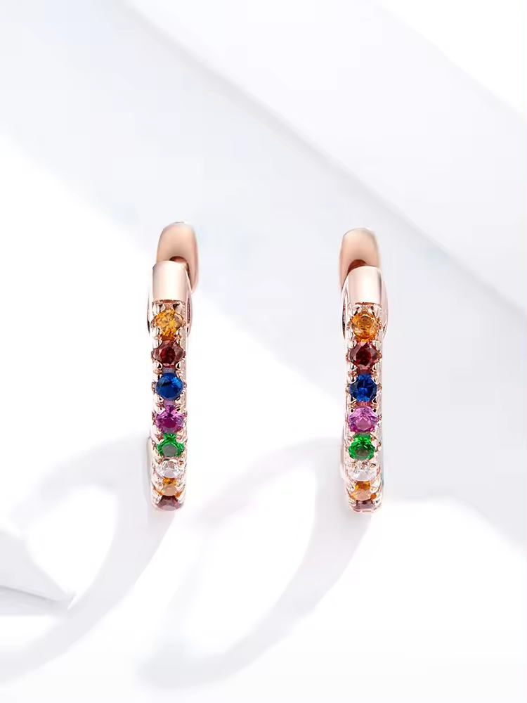 Finisajul rose gold adaugă o notă caldă și sofisticată, iar inserțiile de zirconii colorate creează un efect vizual vibrant, inspirat din spectrul curcubeului. Această combinație transformă cerceii într-un accesoriu versatil, potrivit atât pentru ținute casual, cât și pentru ținute elegante sau de seară.